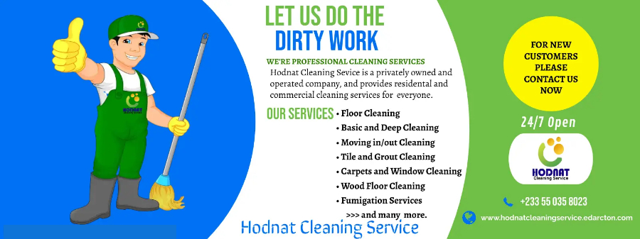 Hodnat Cleaning Service is a registered Ghanaian company that offer benchmarked cleaning services. We are a residential and commercial cleaning company dedicated to using only the safest cleaning products, keeping both our customers and their homes clean and healthy. Our goal is to give you peace of mind when it comes to cleaning your home or office. That is why we are committed to using green eco-friendly products that are safe for you and the ones you love! We provide top-notch services that are tailored to the specific needs of each and every one of our customers. So if you are in need of some tidying up, Hodnat Cleaning Service will get the job done right, on time and on budget.